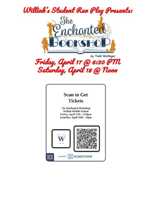 Performances will be in the Willink Middle School cafetorium on Friday, April 17 at 6:30 p.m. and Saturday, April 18 at noon. Purchase tickets online at Enchanted Bookshop Tickets or scan the QR code on the poster below. There will be limited ticket sales at the door as well for $5 each.